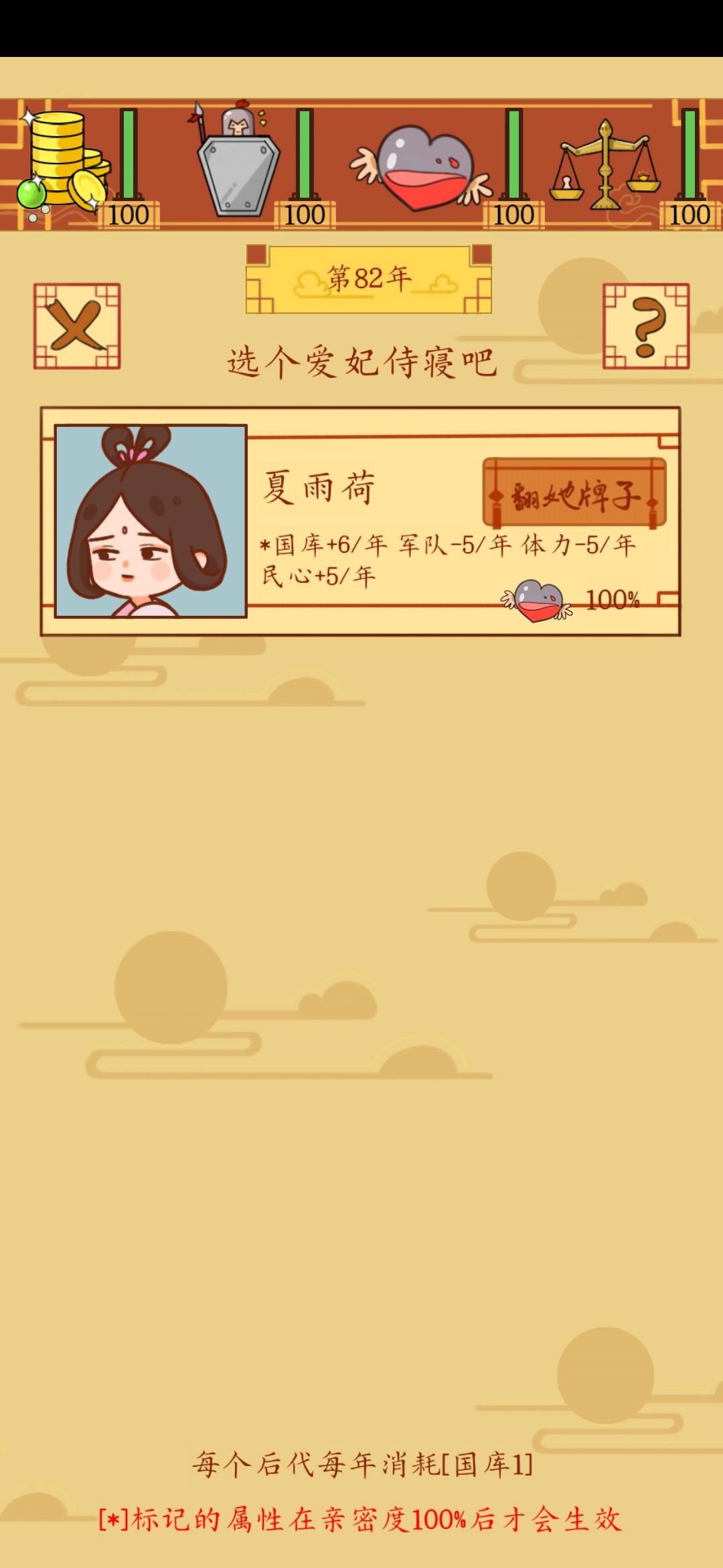 这时候你可以开一局,开局找个妃子,然后生个属性高的孩子就收手,孩子最好高属性管3个到四个,四个的很难刷,反正非酋如我。然后再找个妃子,最好四个属性都能顾得上。我以前试过,有两个孩子,各两个高属性,但是有可能玩久了会觉得很麻烦,毕竟要总是换储君,再加上可能有的属性顾不上会导致全线崩盘。所以最好能四个属性都大于零,然后稳住不要浪。差不多就这样了....