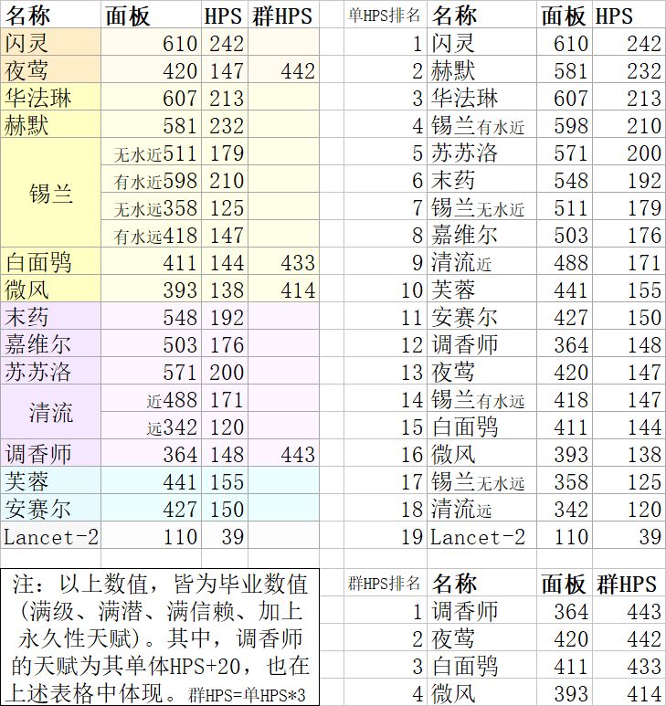 #对于闪灵、赫默的HPS,表格中已计算天赋带来的影响