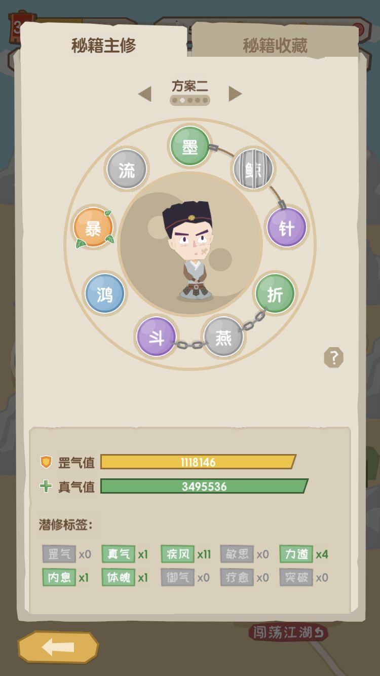 针对外功boss,功法优先选择连击类、封印类、减伤类,潜修标签选择疾风、力道。