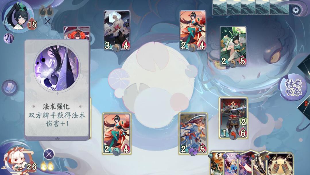 萤草的阵容是清姬、大天狗、凤凰火和萤草。他们都拥有许多法术牌,配合萤草的被动技能可以对我们造成不小的麻烦。但萤草作为柔弱少女,只有15点生命,我们可以从此处下手。虽然法师阵容拥有多种法术牌,但相对应的,这些式神的身板都较为脆弱,难以抵挡我方攻势。