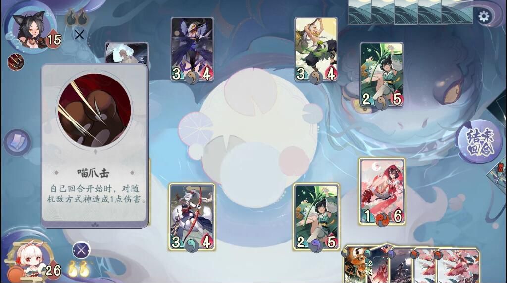 九命猫的被动技能是“喵爪击”,技能效果是自己回合开始时,对随机敌方式神造成一点伤害。这个被动技能使得每回合对手回合开始时都能打出一点额外伤害,若刚好作用在我们残血式神身上,就能起到补刀的效果。所以我们要想针对这个技能,就尽可能使我们式神在敌方回合开始时至少拥有两点生命值。