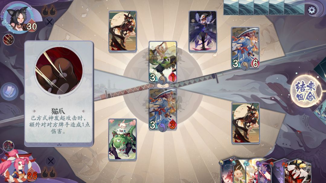 本局游戏中,敌方牌手的被动技能为“猫爪”,当敌方式神发起攻击时,额外对敌方牌手造成1点伤害。这个被动技能相较之前我们遇到的技能,可以说是弱化很多,但因为本局敌人的四个式神都拥有多种战斗牌,用于触发猫爪效果,所以也不能掉以轻心。