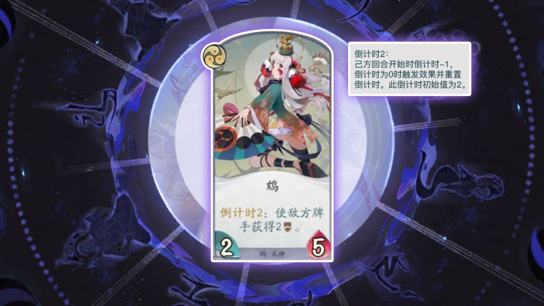 卡牌效果:自身变为4点力量6点生命,当敌方式神本回合第一次获得破甲时,鸩的倒计时-1