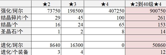 粗略算了一下,从收集R2材料到升级为R4满级40级,大概需要的珂尔、晶石、装备数量如下: