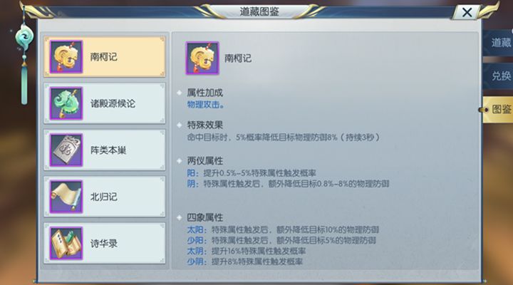 天机阁自身是物理输出型职业,所以对敌人造成的都是物理伤害,在这里推荐的第三本道藏就是南柯记了,首先可以对物理攻击有所加成,而且在命中目标的时候会有概率降低敌人物理防御的8%,敌人物理防御的降低也就是天机阁的输出能力的提升。