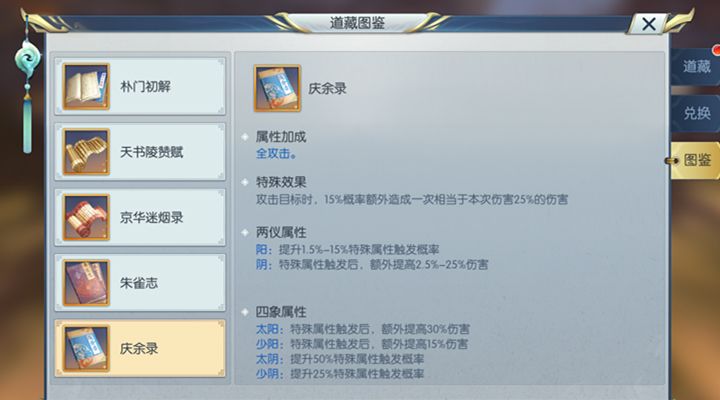 对于天机阁来说,第一本道藏推荐肯定是庆余录了,它对天机阁的攻击属性有所提高,而且在攻击目标时有15%的概率会额外造成一次相当于本次伤害25%的伤害。前期所有的职业伤害都不是太高,庆余录可以提高天机阁的伤害,而且额外造成的伤害能够让天机阁在前期对敌人造成的威胁更大。