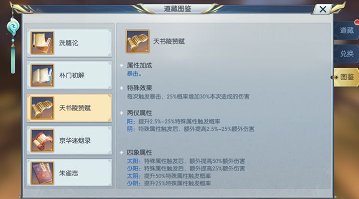 天机阁是输出职业,在道藏的选择上肯定是以提高输出能力为主,在第一本道藏庆余录选择之后,自身的伤害已经得到了提高。这个时候天机阁需要考虑就是自身的暴击效果了,毕竟天机阁对自身的暴击也是十分的依赖,她的一个技能闪华之吻更是和暴击息息相关,产生暴击会对敌人有额外的眩晕效果。在这里推荐的就是天书陵赞赋了,佩戴之后提升天机阁的暴击属性,而且在触发暴击的时候会有概率额外的增加30%的伤害。这本道藏在提高天机阁暴击效果的时候,对其伤害能力提升也是非常的大的。