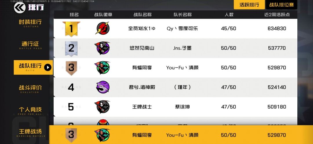 恭喜有蝠同享首登活跃榜第三(战队招人中)