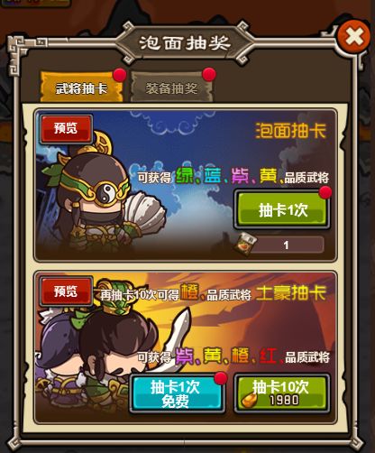 普通泡面袋池有绿、蓝、紫、黄,四种品质的武将。