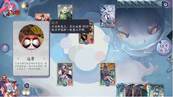 我方牌手的被动技能是“达摩”,效果为己方式神气绝后两回合复活;跳过升级阶段;每三回合获得一张“提升”(两回合后触发)。“提升”不消耗鬼火,在“红达摩”、“利刃”和“防卫”中选择一张置入手牌。