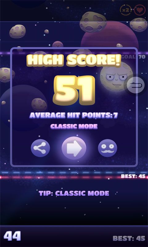 bangbangbang~要说这是一款射击游戏(误),画风简单可爱,操作是玩家可以根据月亮漂移的轨迹来进行射击月亮,玩完后满脑子都会是魔性的背景音乐,游戏中最令人感到不爽的应该是月亮的表情了,非常非常的贱萌,只想拿小火箭biu它一脸,忘了说,不射中已经很不爽了,射中后面还会分离出一个个红月,不仅帮月亮阻挡视线还肥肠让人感到森气!(╯°Д°)╯为什么我要玩这个啊,bgm在脑子里已经中毒出不去了!