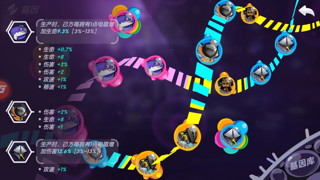 这套卡组的思路是放弃法术卡的使用,然后利用变异基因的效果电磁越高核心卡的加成越高,不断占点获得电磁,后期能得到巨量的加成。