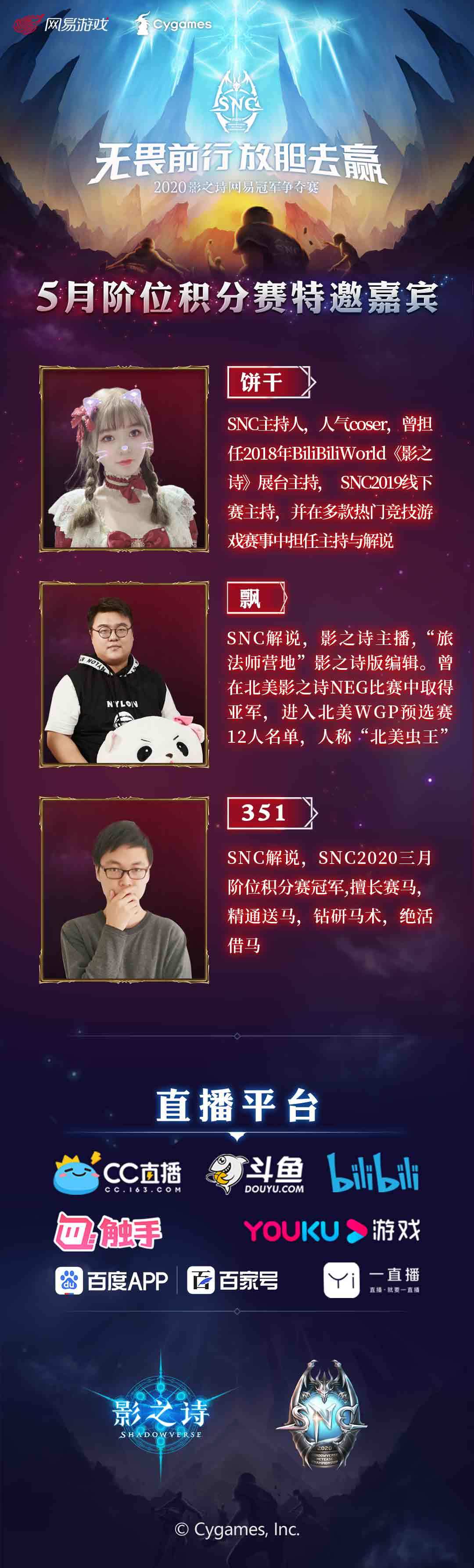 与此同时,2020SNC官方解说招募计划将于全年同步开启。听说作为主战者的你热爱赛事,牌技高超,善于分析,见解独到;听说你玩梗产梗,风趣幽默,个人魅力满分。那么你就是我们要找的下一个《影之诗》官方解说。