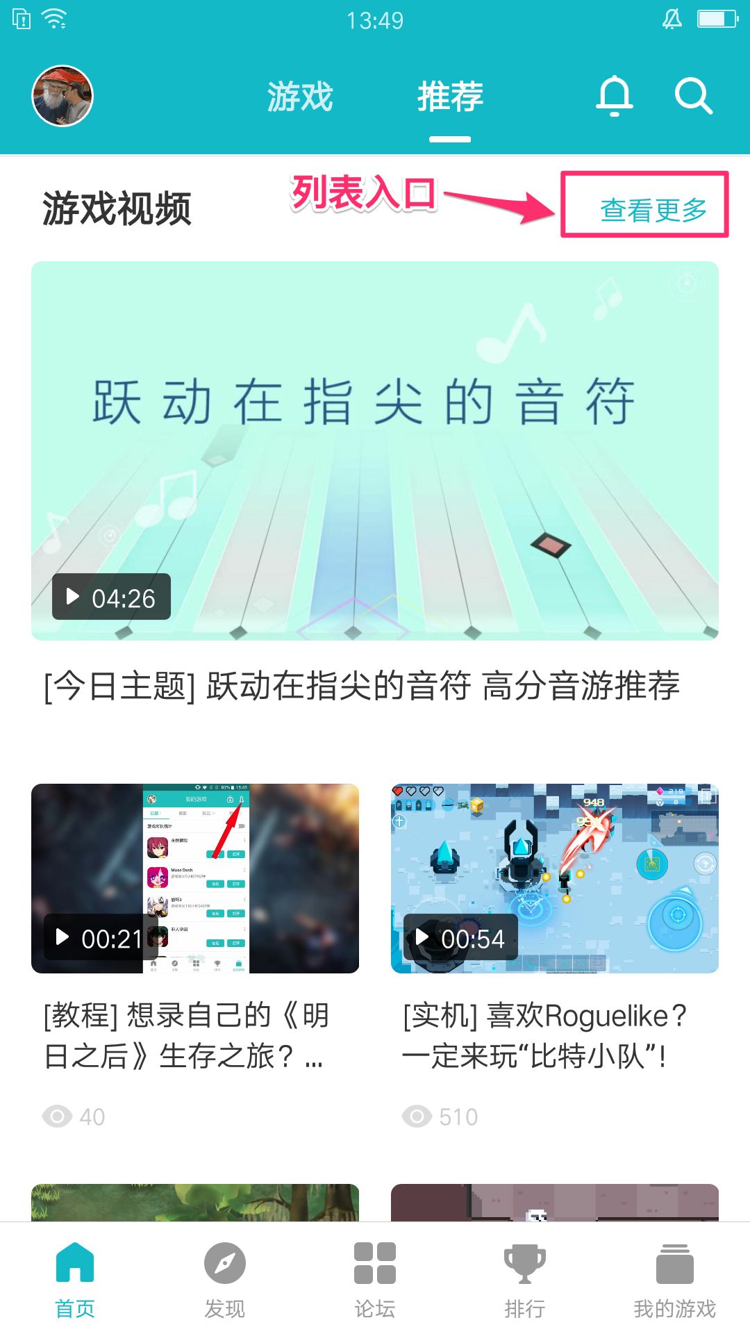 打开APP 在【首页】模块右滑到【推荐】Tab ,下滑到【游戏视频】版块。