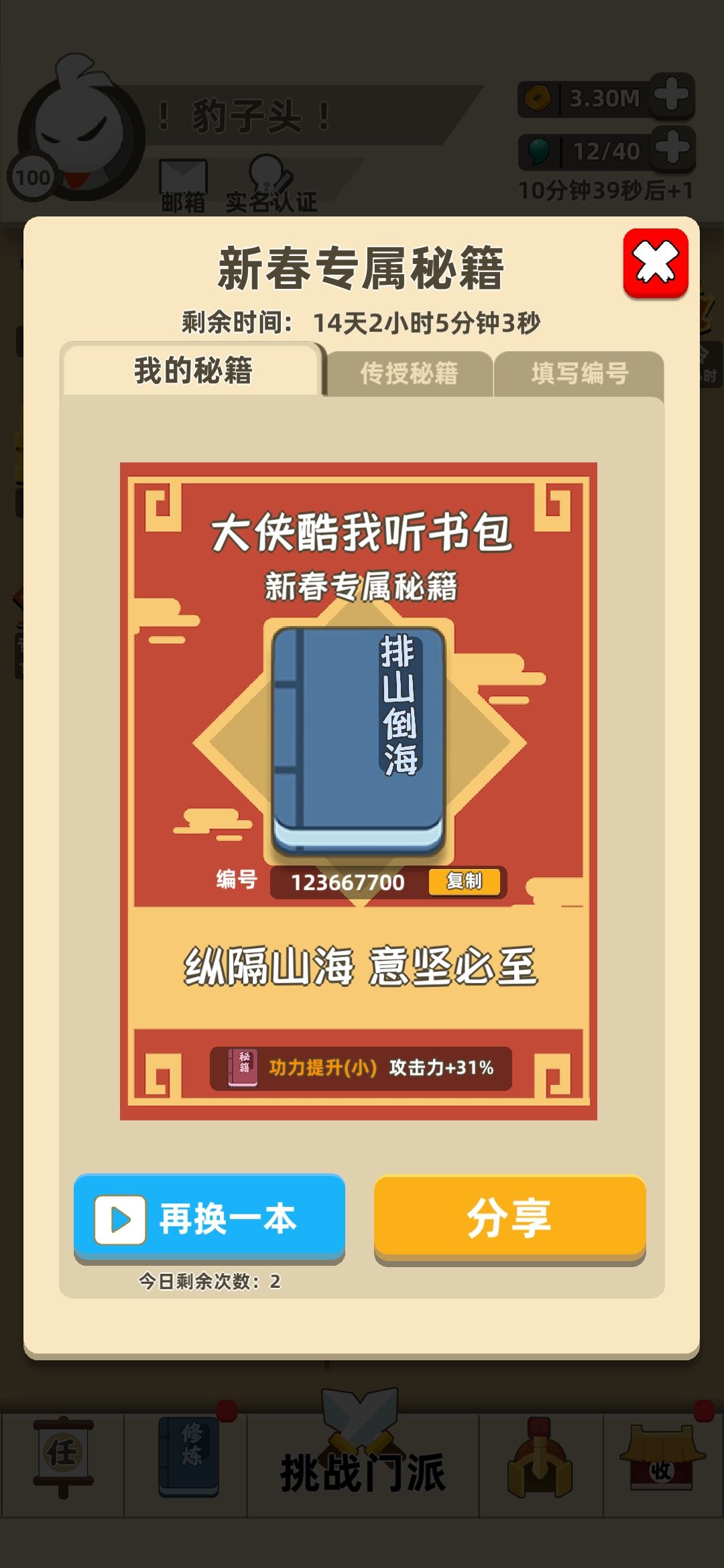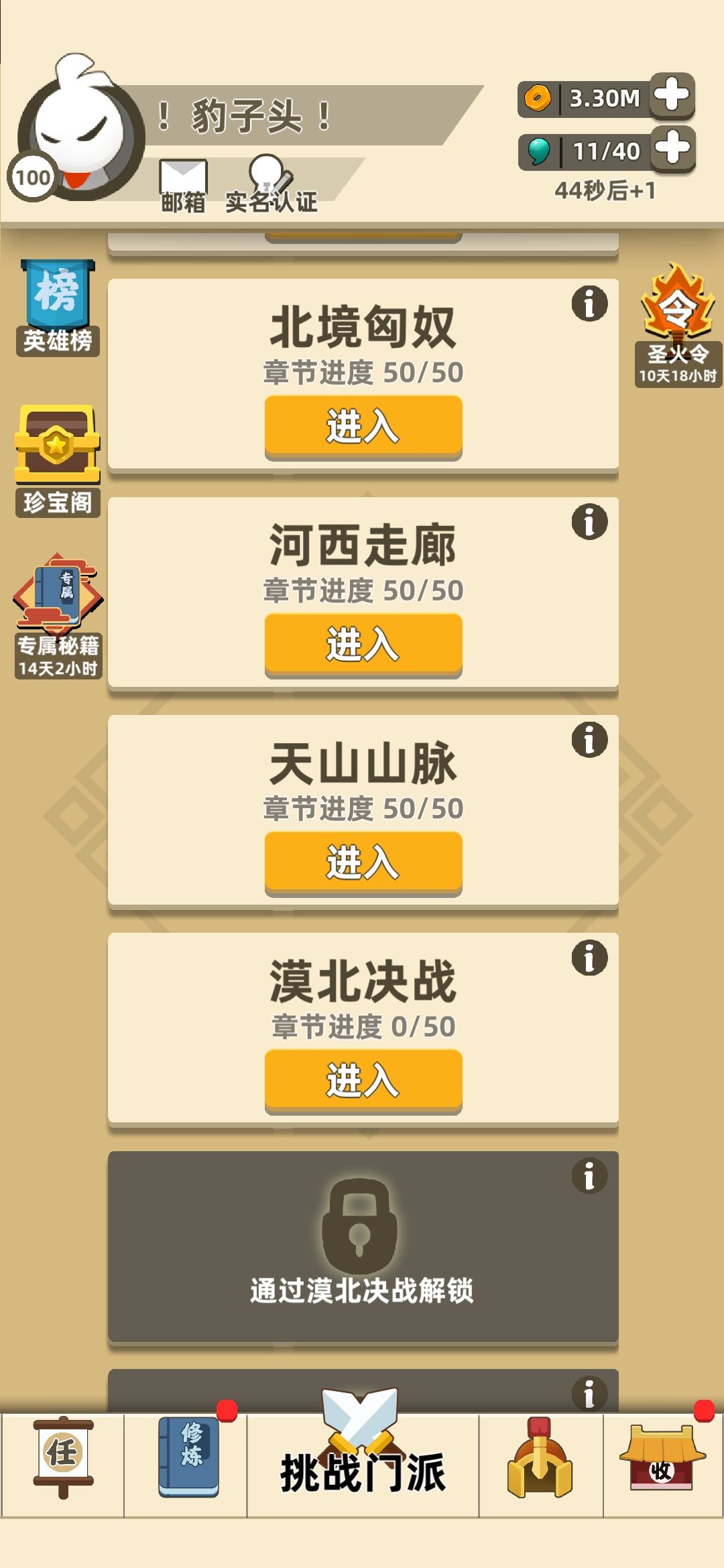 这点属性刚好过天山,如果是和我一样没装备没秘籍的话,遇到金钟罩,加攻击和血量直接拿,最好再带暴击,隔山,背向,排山!因为在没有绝对属性的情况下只能靠点技术。首先,难对付的是刺客,伤害高还是一堆一堆的,所以拿隔山和排山可以速刷而不被围住秒掉,遇到剑士不要怕要么刚,要么等罩子一顿砍!大怪其实是最简单的,慢慢磨,退着打!反正疫情还没接触有的是时间,多打几次肯定好过!