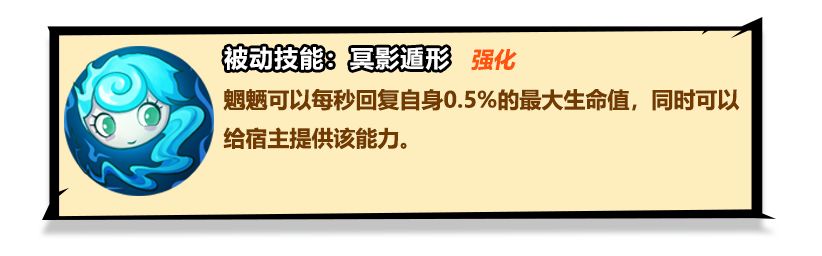 魍魉的被动技能是冥影遁形:可以每秒为其回复0.5%的最大生命值,同时也可以当她开了大招钻入队友的体内后,为队友提供同样的生命回复。对线神技同时也是辅助神技啊,在前期保护大哥打钱的时候也可以不太怕对方英雄的消耗,中后期钻人Gank的时候也可以为搭档提供更高的回复能力,简直就是奶妈中的战斗妈,所有大哥的贴心小棉袄啊。