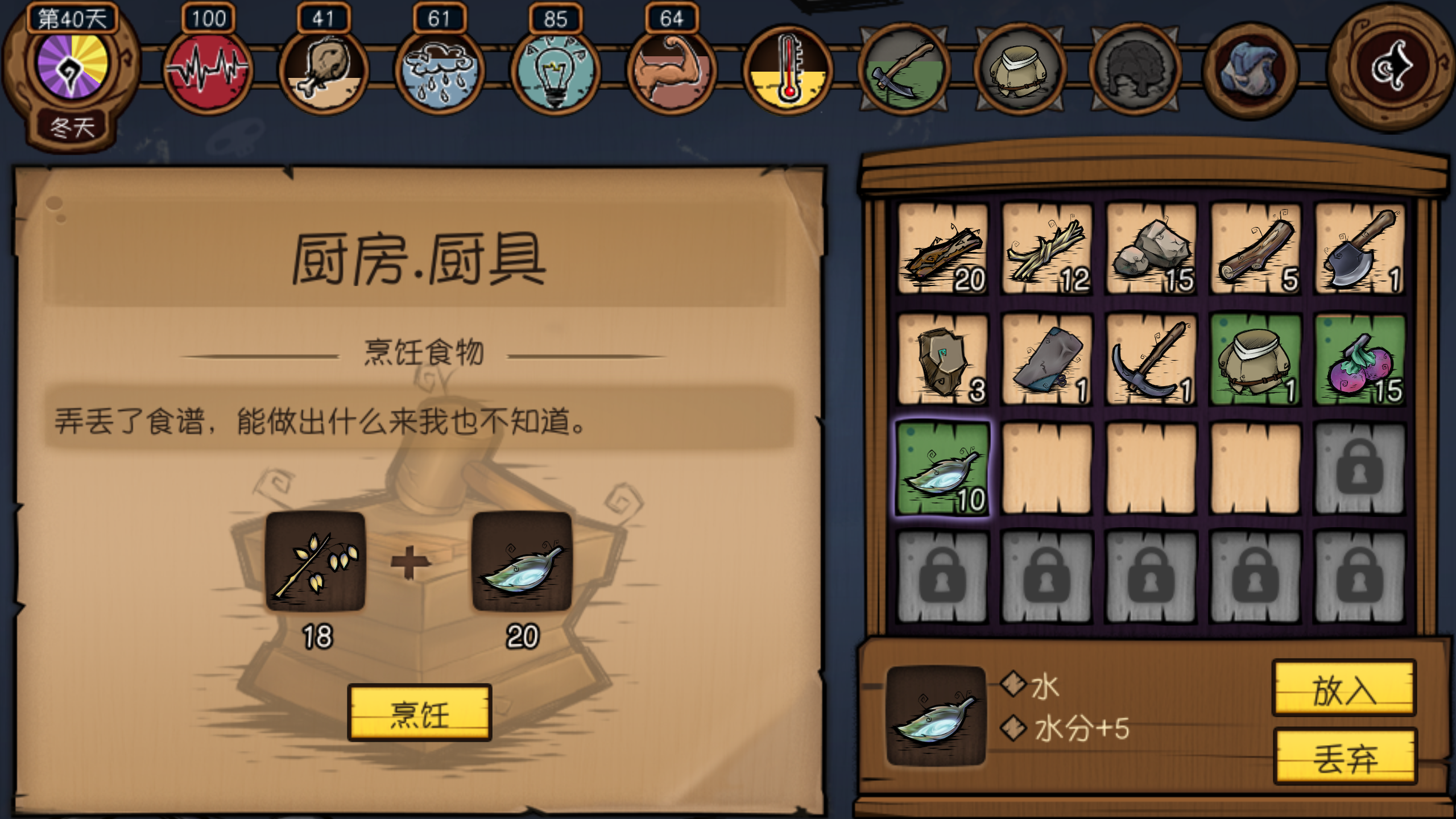15天:水井、厨房、冰窑都有了,这是我开局最快的一次,有了厨房可以加工食物,就是拿果实/小麦+水,再加工或烧烤,比直接吃会加的多,看作者发的食谱,接下来发展科技,科技才是高效率。