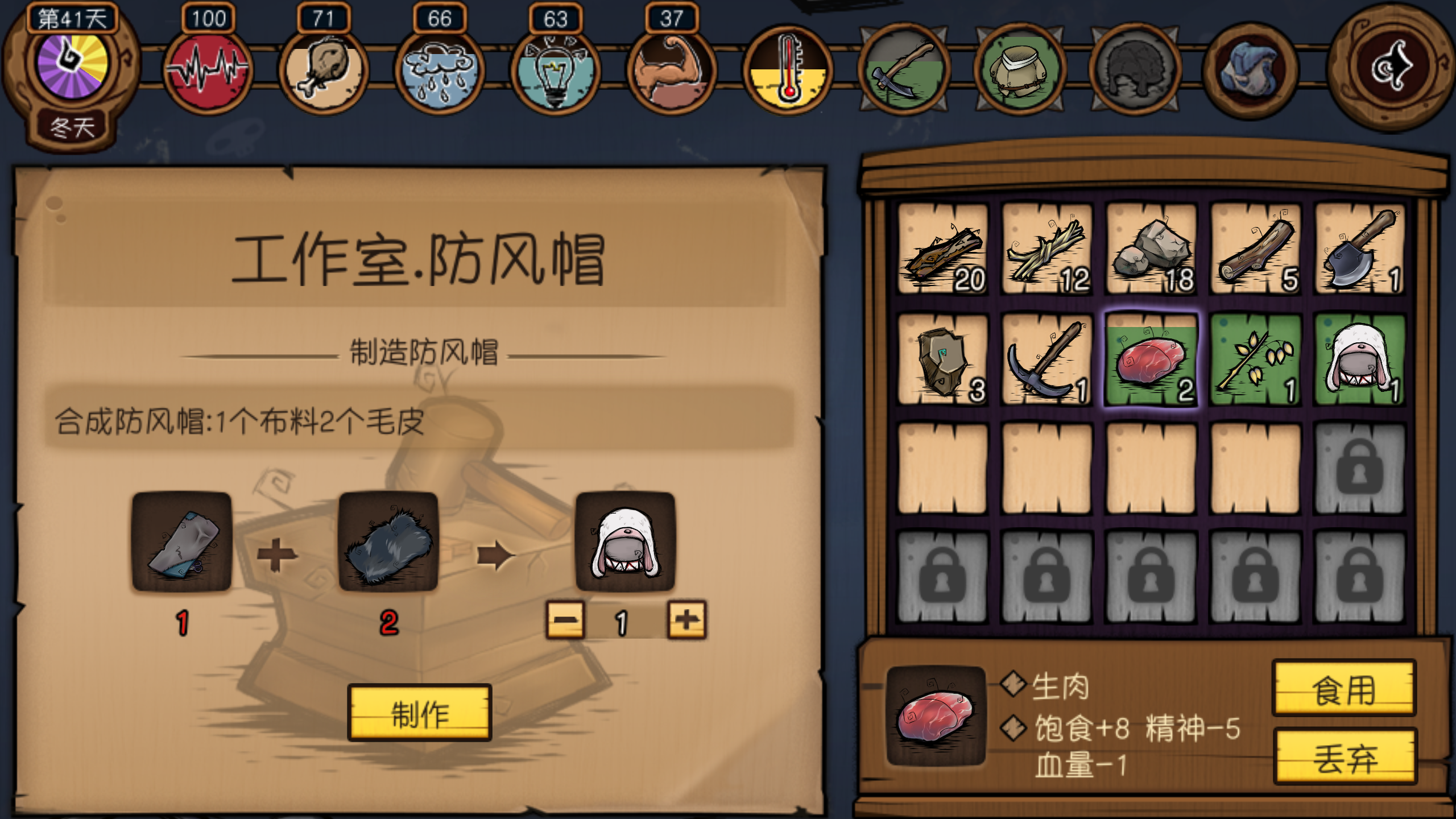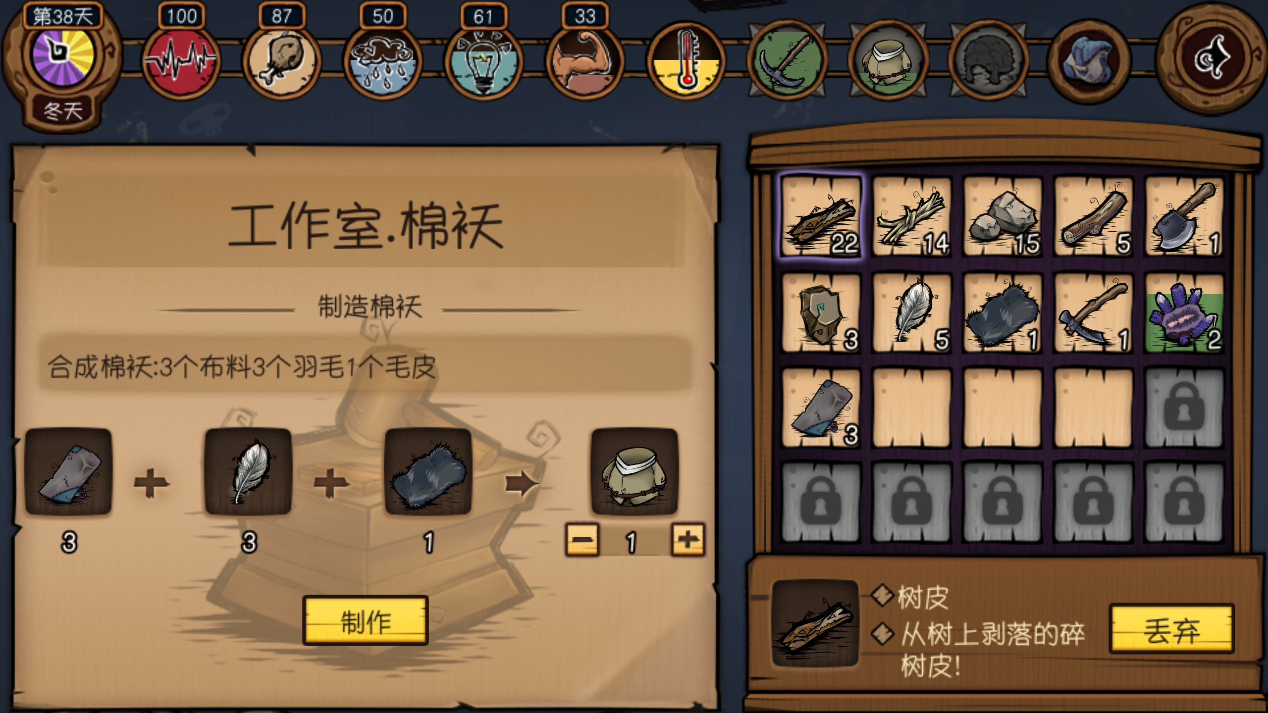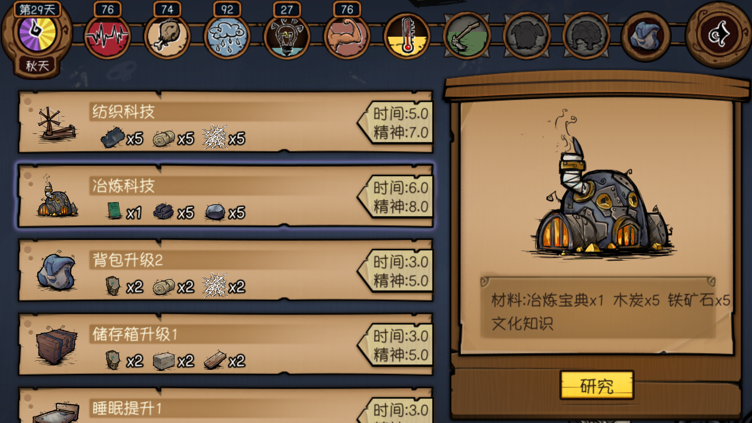 29天:优先冶炼科技,纺织后点开,NPC有送一件棉袄可以顶几天。