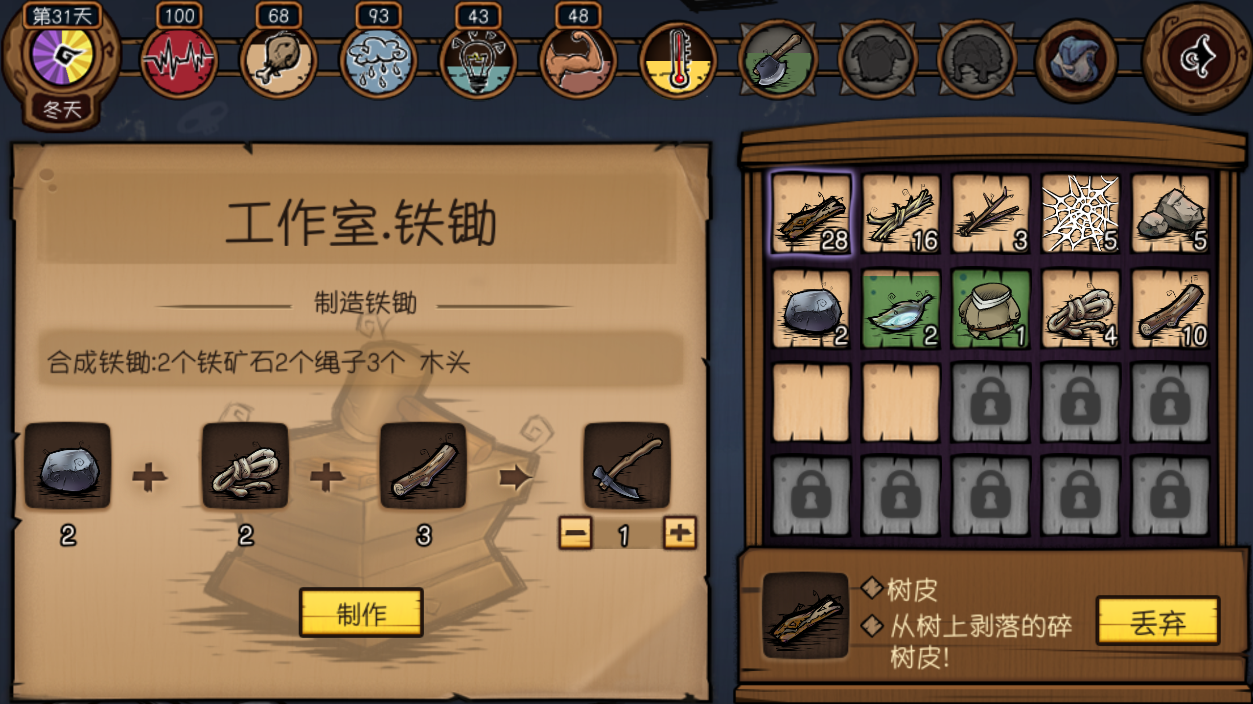 31天:铁器时代来了,再也不用为树枝发愁了,树枝后面好像都用不上,铁锄效率翻倍又耐用,话说我连开局给的石斧头都扔掉,找老头要的铁斧,为了效率。后院的小麦也成熟了,冬天也来了。