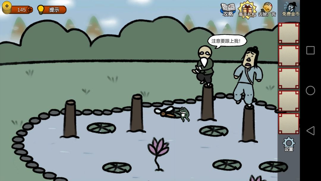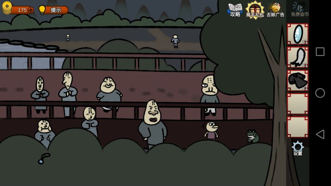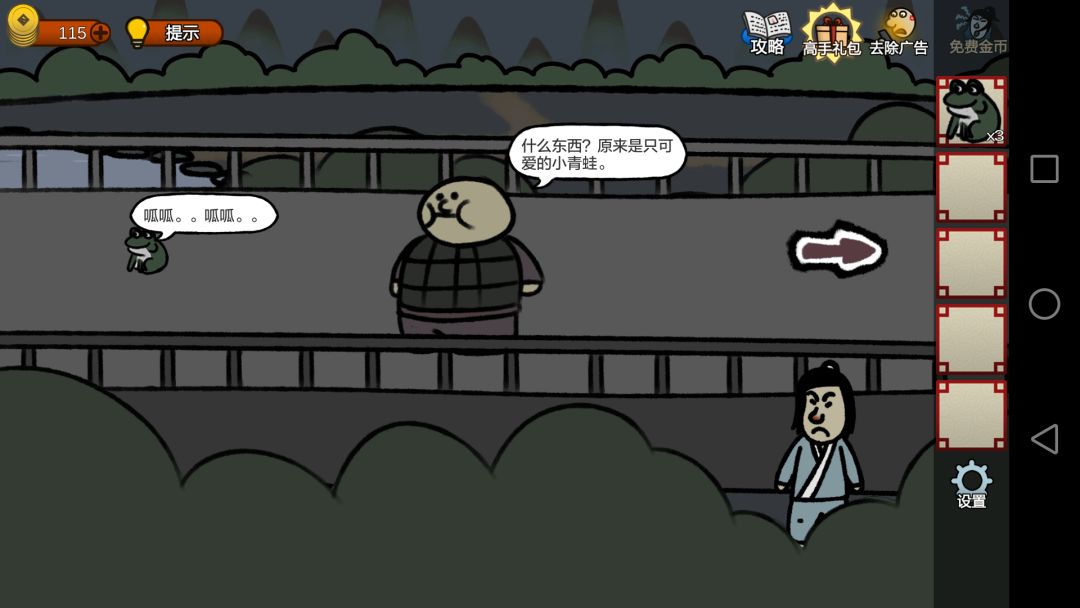 草丛里捡一下小青蛙,青蛙趁着守卫看着右边的时候放在桥的左边。放三次,然后就可以趁着守卫看着左边的时候走人了。