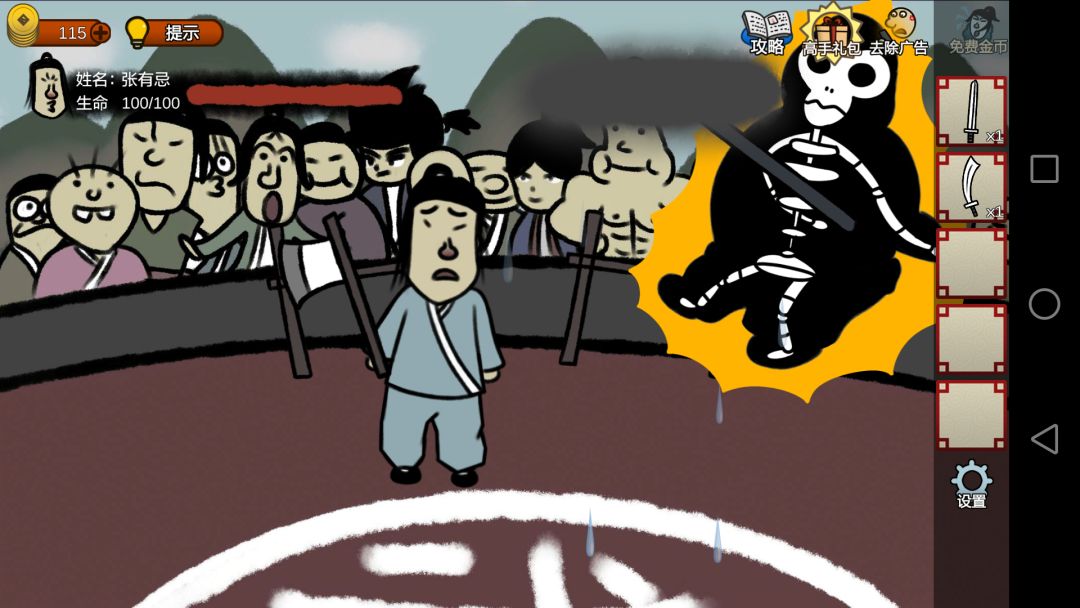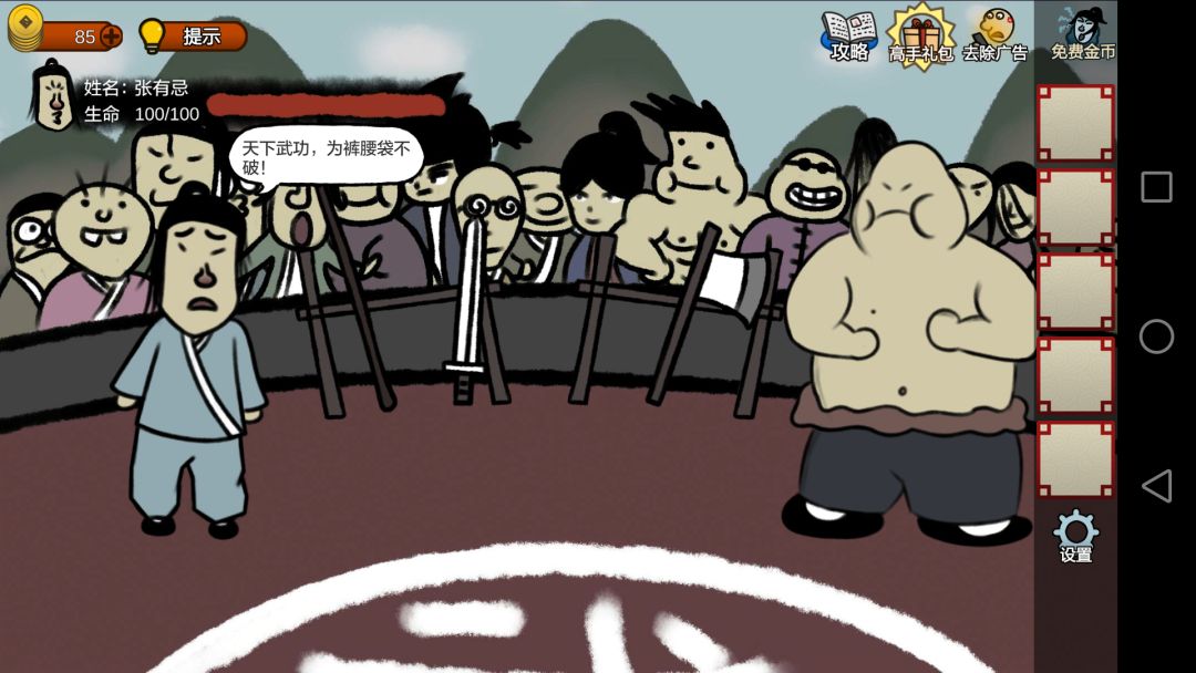 先随便捡把武器,然后点张有忌,掉出钱袋,趁着胖纸捡钱,塞武器给张有忌,手速。