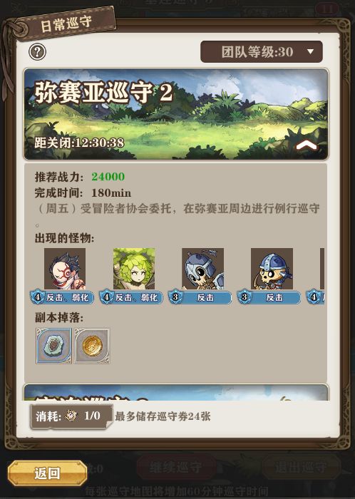 每日5点自动发放当天的巡守劵,使用巡守劵进入巡守副本增加巡守时间,每张门票可以增加一定巡守时间,每个巡守副本最多可以巡守24小时,只有在巡守时间剩余的情况下,巡守副本才会自动进行。
