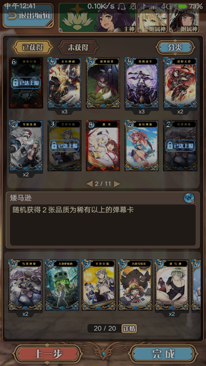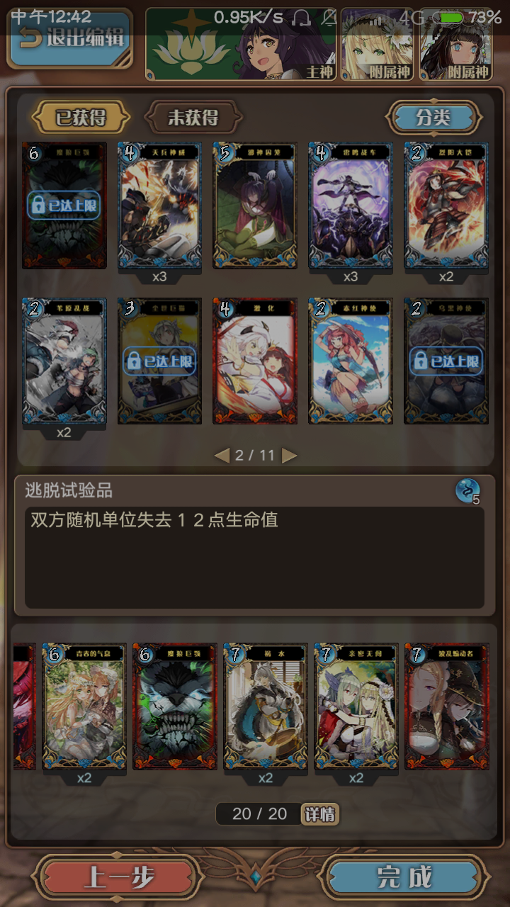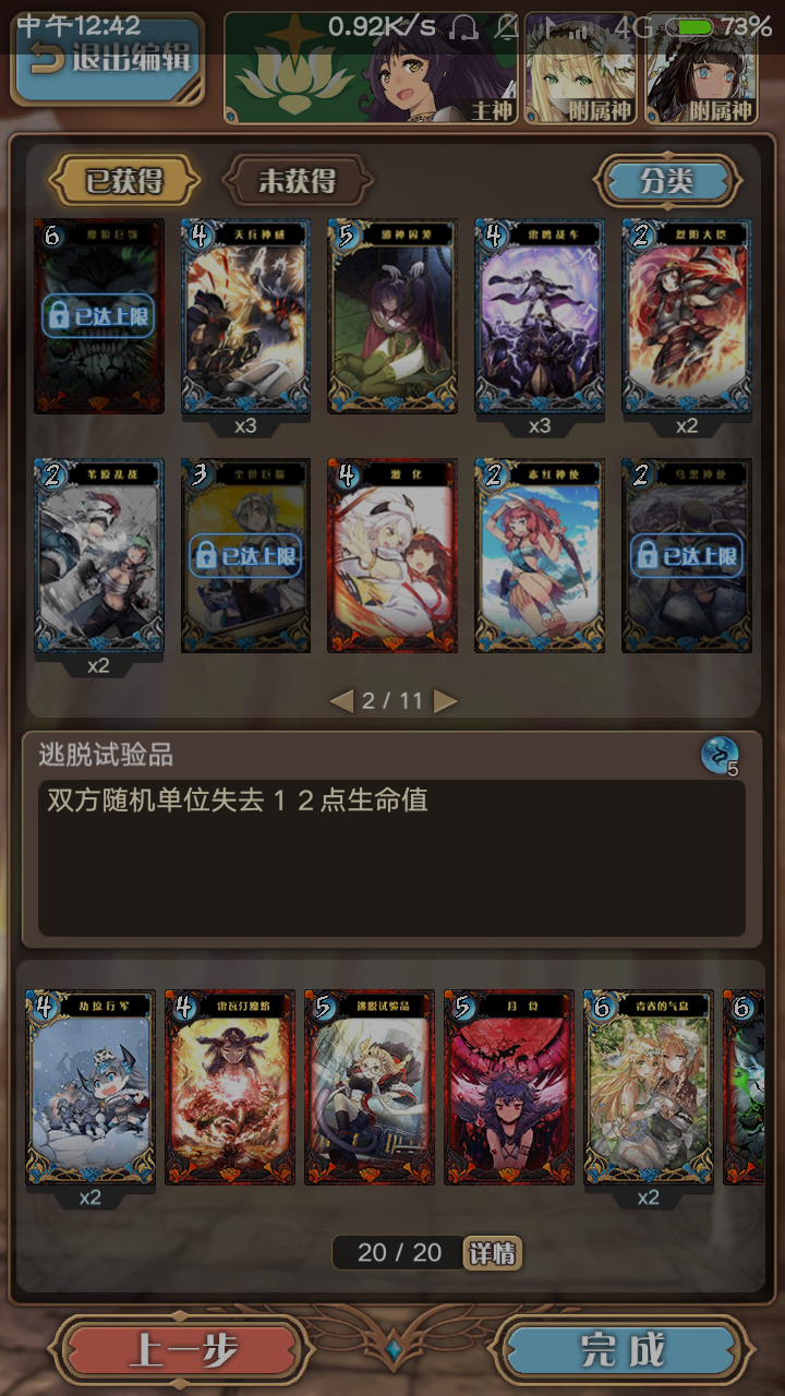 烧血卡组。系统运转依靠主神的神威,和天之常立的辅助,可以每回合移动4次,开对面4次雾并回复3点行动点。天之常立每回合还可以加护盾,这也相当于可以帮主神减免一点伤害。卡组配置。全神迹卡的卡组是真的超魄。烧血带的那些东西就不说了。先说那些可以抽卡的。抽卡的有,八卦炉,八咫乌加护,尘世巨猫,矮马逊和劫掠行军。行军一定要带2,不但可以抽卡,配合附属神回血,还可以把对面的弹幕给除了。特别是那些全场冲击的。矮马可以给你弹幕卡,如果你的奶妈在的话,2张矮马就可以回24点血了。不仅如此,还可以解决掉用了波乱煽动者攻击力降低的尴尬。如果拖到后期,还没打完的话,又没有烧血的,就可以装填弹幕,找到主神后再打过去。2张矮马带来的6张弹幕卡足够你打了。再加上主神的神威,也可以帮助清掉对面的一堆迷雾,找准对面的主神 。苟的,苟的话就是八咫乌加护,尘世巨猫。两者可以帮助抽卡回血,加盾,各带一可以应付不同情况。劫掠行军专门拿来清对面的弹幕,神迹卡。魔狼巨颚用来封锁对面攻击一回合。这个一定要有,封锁对面攻击,相当于你回血。对面如果在封锁攻击的情况下装填弹幕,企图一回合后把你秒了,这样就祈愿抽卡抽到劫掠行军,糊对面一脸。苟的卡并没有多少,只要你有奶妈,主神不是被对面一回合秒的话,都可以奶回来。这套卡组附属神也很重要,被别人针对附属神就完了。因此可以移动主神到没迷雾的地方让对面打。对面如果打到你附属神了,天之常立的加1移动力也可以帮助附属神逃跑。最后,这套卡组遇到套盾流也有几分一战之力了(毕竟有矮马在那里),另外,这套烧血卡组也是比较便宜的,你没有那个莉雅都可以用,天之常立合成1000,奶妈3000。(加上莉雅更暴力)苟的你也可以下邪神囚笼,这个可以减免对面攻击10一回合。胜率:昨天和今天共打了7场争乱,只输一场。
