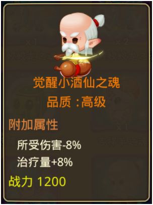 觉醒小酒仙之魂:提升8%的治疗量和减伤效果,看看这个效果就知道这个精灵之魂不得了,完美的属性类型,简直是奶妈必备的极品道具!