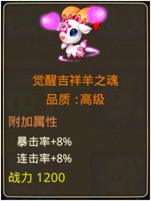 觉醒吉祥羊之魂:暴击率和连击率+8%,它的优势在于无论是法系还是物理系英雄都可以完美运用,暴击率和连击率也是强强组合,装上后仿佛是嚼了炫迈,连击+爆击根本停不下来!