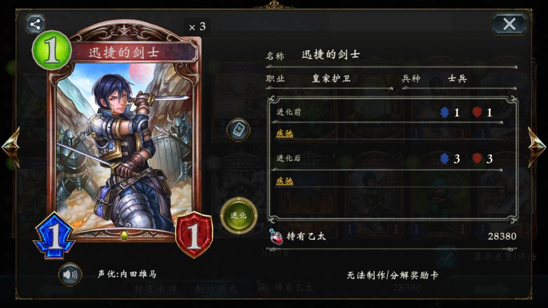 ②进化点(ep):先手有2个,第5个回合开始可以使用;后手有3个,第四个回合开始可以使用。为先后手平衡机制。随从被进化后可以立刻对随从进行攻击,并改变卡牌为卡面描述“进化后”相应的内容。如有“进化时”条目,则进化发生时可以发动其能力。