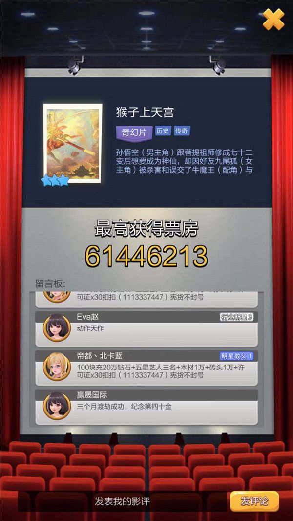 5.拍摄成为金本之后,我们会更加容易的优先让媒体宠儿艺人进入剧本的拍摄,从而更容易的取得高票房,为小组排名和服务器排名增光添彩!