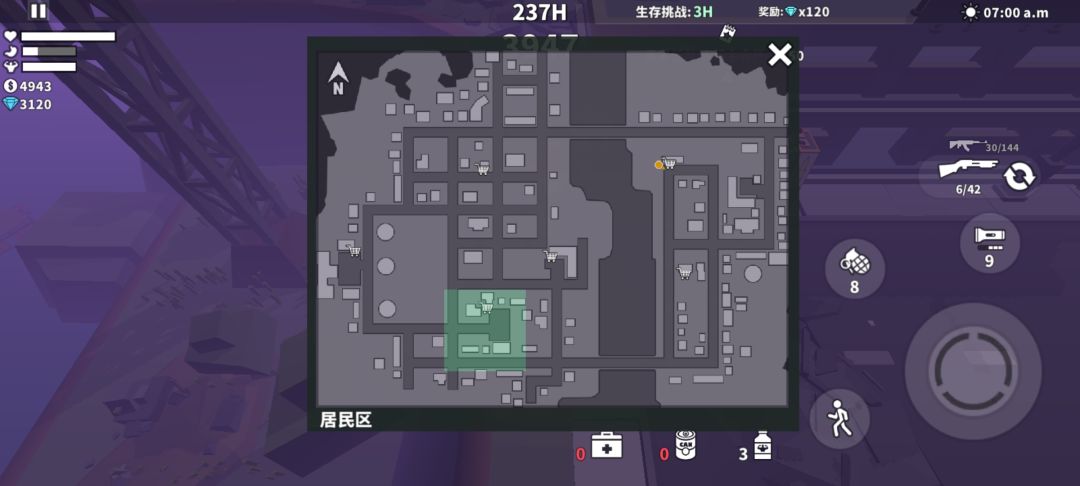 这两个点可以说是夜晚比较安全的地方,因为很简单,有那么一小点光,虽然说只要把区域内丧尸清光就不会再生成了,但难免有漏掉的情况,这一小点灯光就可以在没有手电筒的情况下看见僵尸了,在120小时过后,会有一个boss出现,那时候就拼你所有的火力,我AK子弹全打光,再加个几发霰弹,就解决掉了,到了后期,只要到达一个空投点,基本就是一堆僵尸,所以离空投点远点是最好的方法,找到一个有售卖机的地方,就看脸了,能不能出食物,或者绕开空投去找地图上面随机刷的物资,这样的话就不会有太多僵尸,比较需要注意的就是狗,和那种喷减速的僵尸,然后实务方面的话,罐头等到肚子饿了,并且左上角的肚子饿的时候产生的黄条结束再吃,基本上一个罐头撑两天,五个罐头,也就是十天,也就是240小时,我用的初始角色,所以一个罐头只能撑一天半左右,为了节约罐头,我是等血扣到最后一点才吃的,一般人不要模仿,容易暴毙,毕竟只要站着不动就可以慢慢回血,但暴毙一回可就惨得很了,同样的,如果你真的没食物了,死一回,复活也是个非常好的打算,复活之后又是满状态,又可以撑一天。