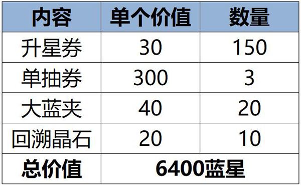 升星券原价30蓝星1份,礼包内含150份;单抽券每份300蓝星,礼包内含3份;大蓝夹在药瓶buff下都要40蓝星一个,礼包内含20个;回溯晶石原价20蓝星一个,礼包内含10个,都是超超超实用资源,总价值高达:30*150+300*3+40*20*20*10=6400