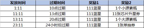 双十一当日登录游戏, 四个时间段邮件奖励发放: 1:11 送出蓝星*111,小源素瓶*1; 11:11 送出蓝星*111,升星券*11;13:11 送出蓝星*111,大源素瓶*1;23:11 送出蓝星*111,单抽券*1。