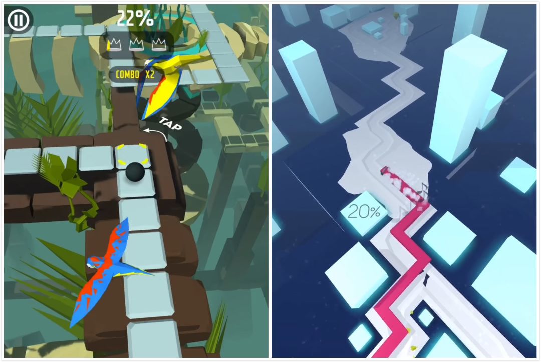 除了玩法不同,两款游戏画面和视觉处理上也不太一样。都是低多边形风格,《跳舞的球》这次加入了视角的转换。