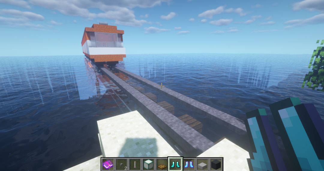 首先我们要准备好材料:一双附魔了冰霜行者的靴子具体怎么操作呢?放置一个铁砧,然后在其中放入钻石靴子和冰霜行者附魔书,就可以把需要的靴子做出来!(你问我图里的铁砧在哪里?一看就是没有看之前的水上列车教程,列车行驶的铁轨就是铁砧做的呀~这篇看完快去看那篇!)