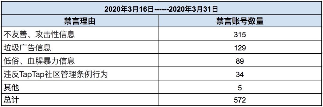 三月下半月禁封账号总量为17889,本期禁封账号数量有大幅增长,增长量集中在对于水军账号的处理。本月21日,TapTap管理团队主动出击,查处了一大批有不良行为的水军账号,再次守护了评分的真实客观。本期因多次发布不友善内容被封禁的账号量依旧有明显增长,请各位taper友善交流,珍惜账号;