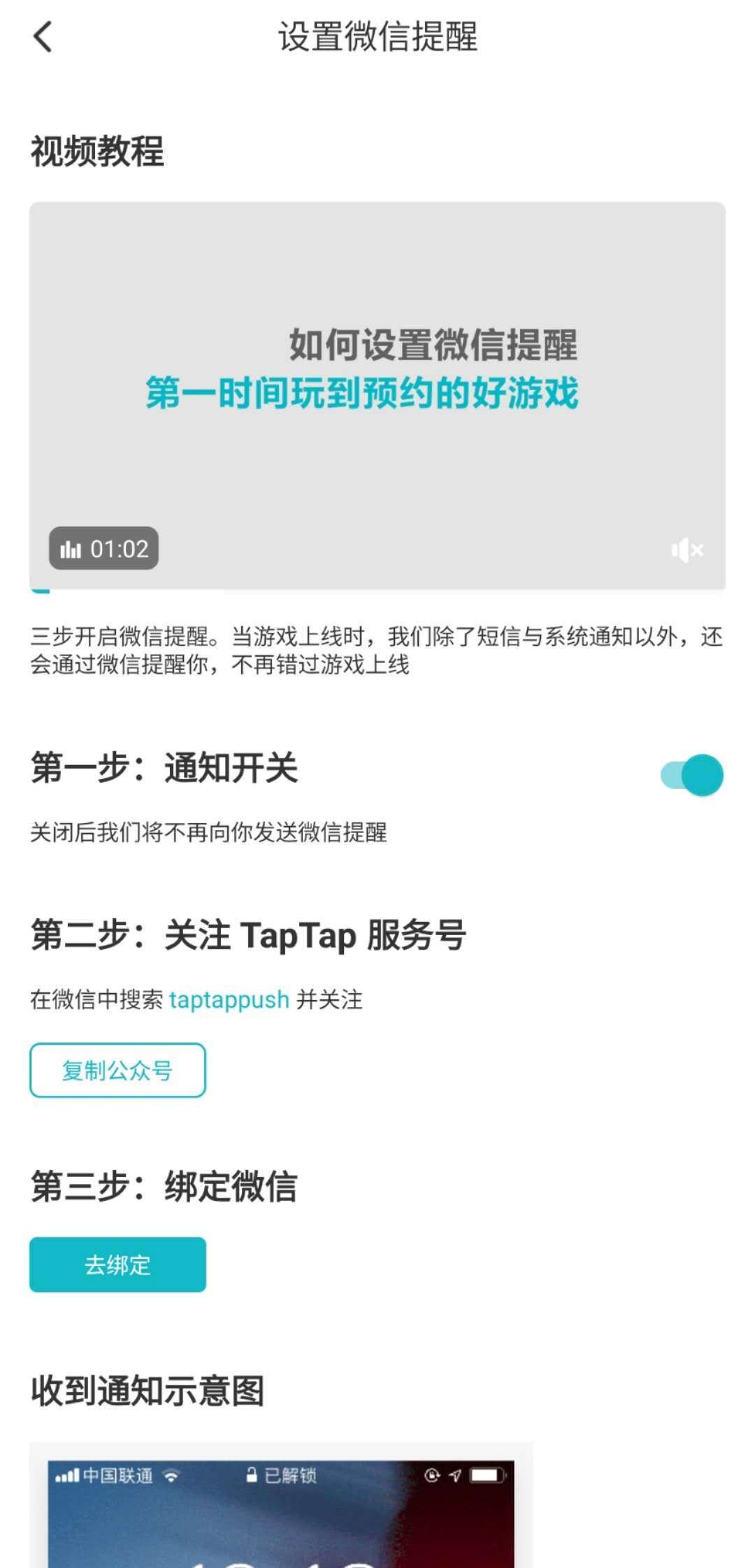 打开通知开关后,微信关注“TapTap服务号”(微信搜索taptappush)并绑定微信后就可以收到预约游戏的相关通知了~