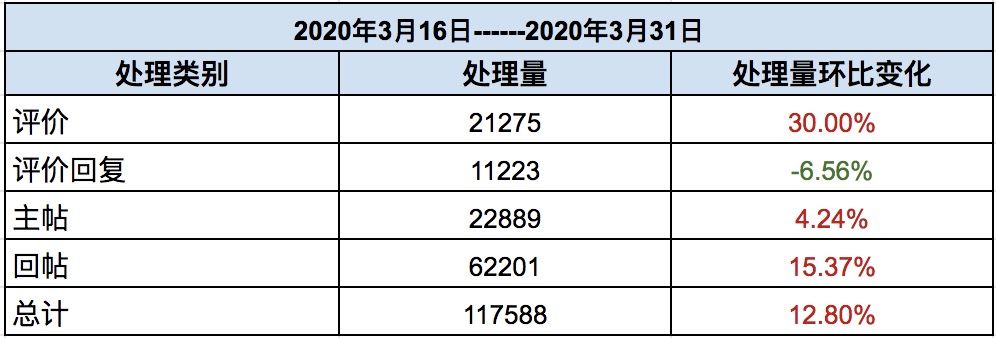 三月下半月内容处理量为117588条,平均每日处理内容7839.2条,本期处理量的增长主要来自于大批水军账号的封禁,可以看到评价处理量同比增长30%,除此以外,回帖也有较为明显的增长,多数来自于对不友善用户的恶意内容的处理。