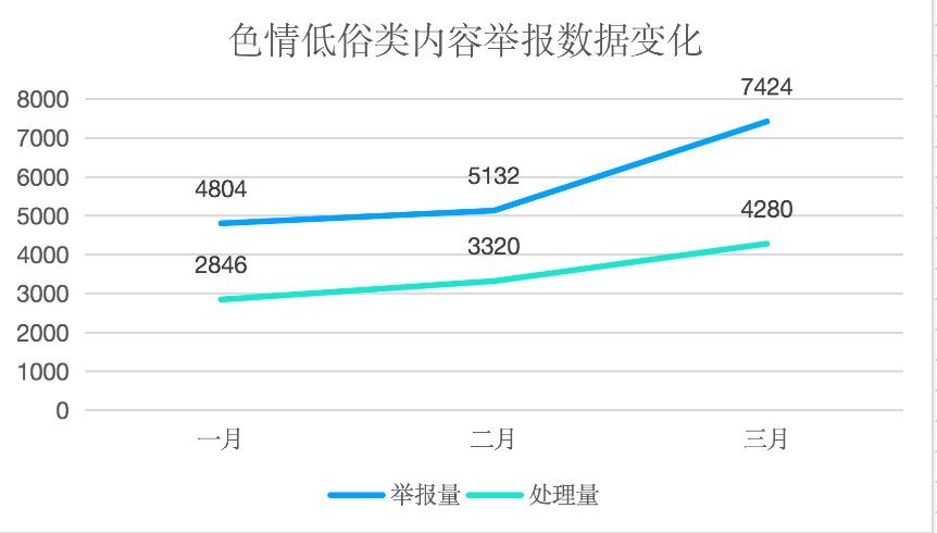 从举报数据上来看,第一季度色情低俗类内容的举报量整体呈上升趋势,但处理量的增幅从二月开始明显低于举报量。由此可见,在本次整治中,大家的积极参与为社区风气的净化做出了巨大贡献,同时在持续的高压处理下,实际违规的内容在逐步变少。