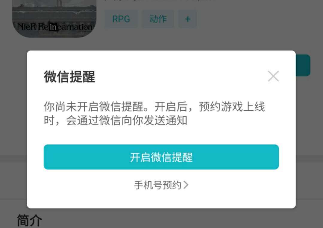 首先找到想要预约的游戏,点击预约按钮,如果之前没有使用过微信预约或是未开启微信提醒,就会弹出下列窗口: