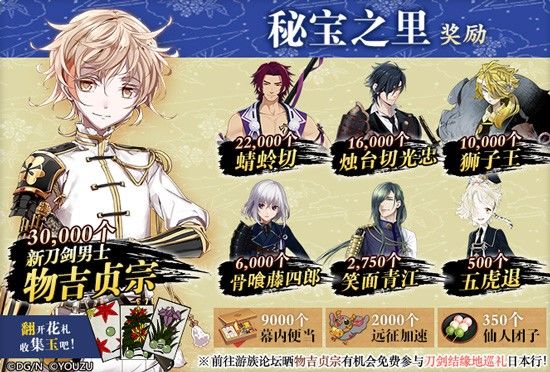 玩家累计收集玉的数量满足条件时,奖励将会送入收件箱。累计收集30000玉,即可获得全新的刀剑男士——物吉贞宗!