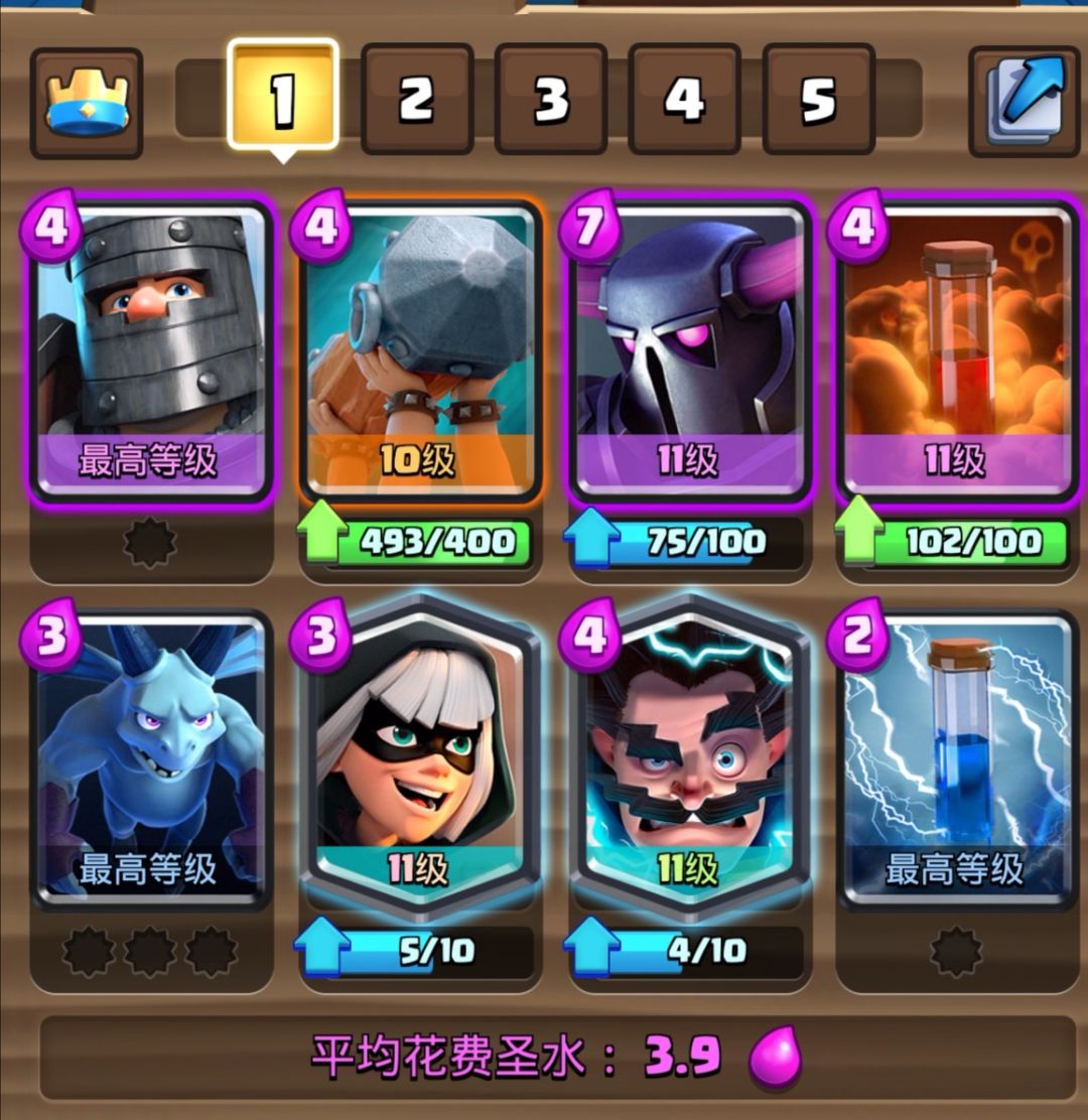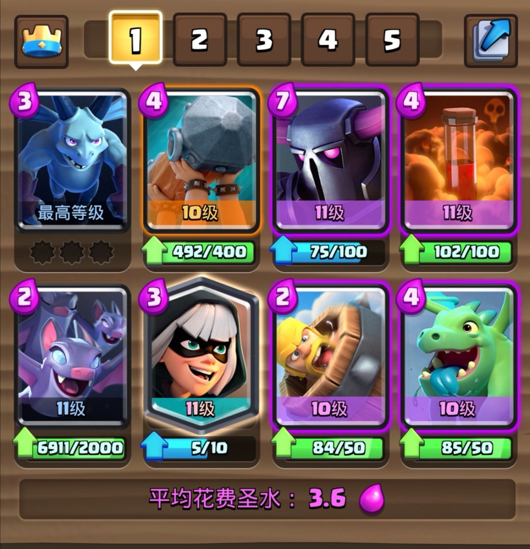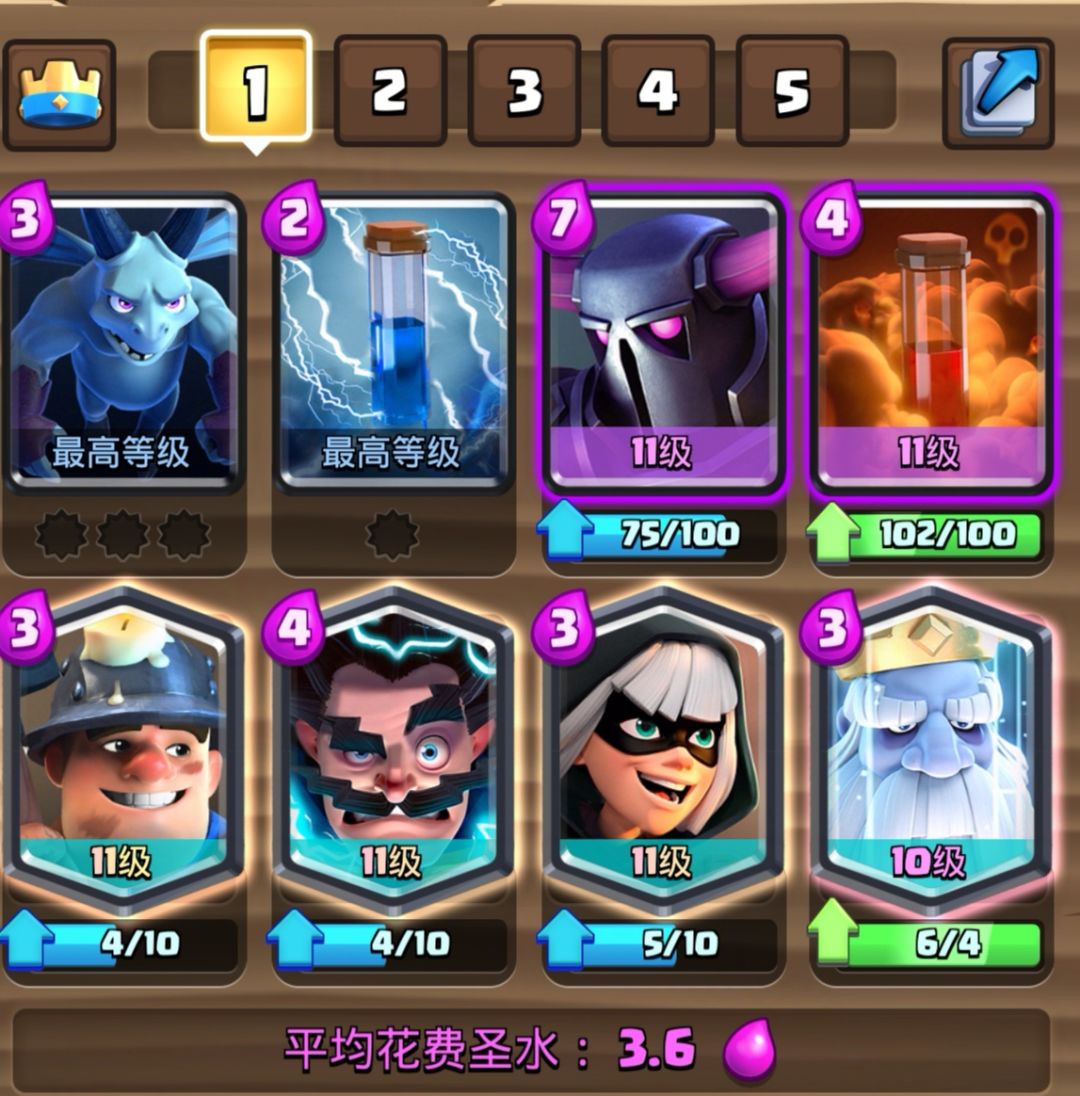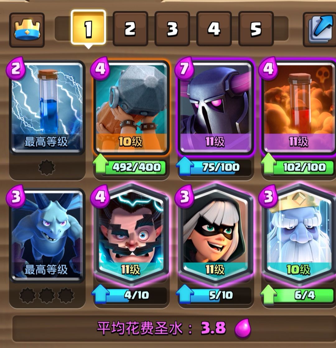 3.8的经典皮卡锤,地面辅助进攻卡是幽灵和刺客。这是一套中规中矩的卡组,只是三张传奇卡要提升卡等有一定的难度。这套卡我们经常在皇室TV里面看到,不是这套卡强度高,而是很多高手在用,可见这套卡有一定的泛用性。