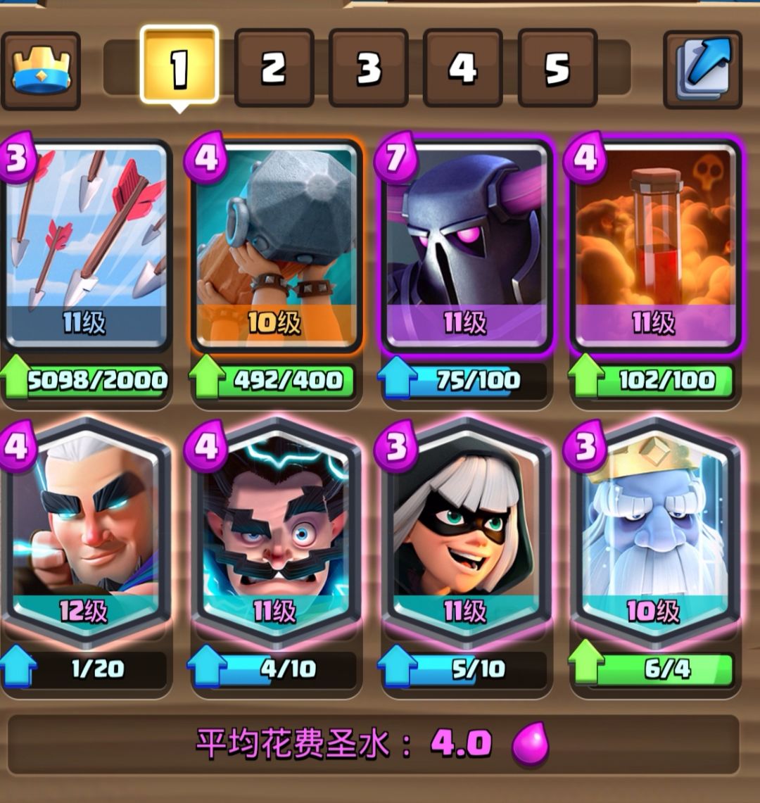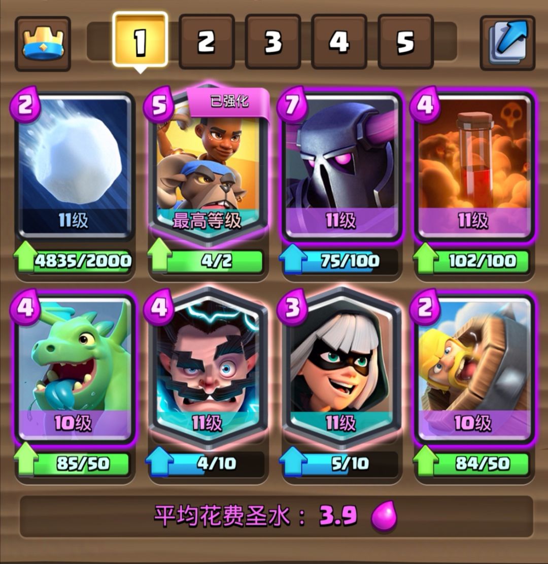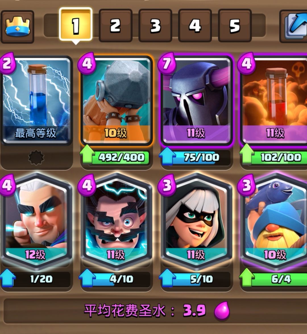 3.8的经典皮卡锤,地面辅助进攻卡是幽灵和刺客。这是一套中规中矩的卡组,只是三张传奇卡要提升卡等有一定的难度。这套卡我们经常在皇室TV里面看到,不是这套卡强度高,而是很多高手在用,可见这套卡有一定的泛用性。
