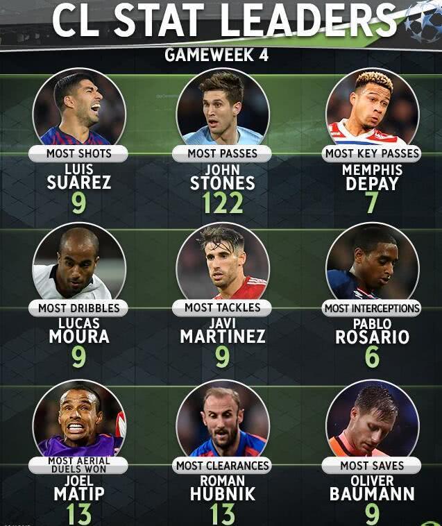 腾讯体育11月9日讯 欧冠第四轮小组赛已经全部结束,著名的足球数据媒体《whoscored》也对本轮欧冠球员的各项数据进行了一次统计,也给出了本轮欧冠的各大数据王。其中巴萨前锋苏亚雷斯射门次数9次,成功了射门王。曼城后卫斯通斯传球122次,是传球王,而前曼联球星目前在里昂踢球的德佩关键传球次数7次,在这一数据上位居首位。