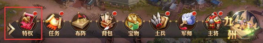 特权玩法的入口在游戏内首页右下角九州边上的小三角箭头点击开启后看到的菜单栏内,下图中框出来的就是我们的特权玩法了哦~