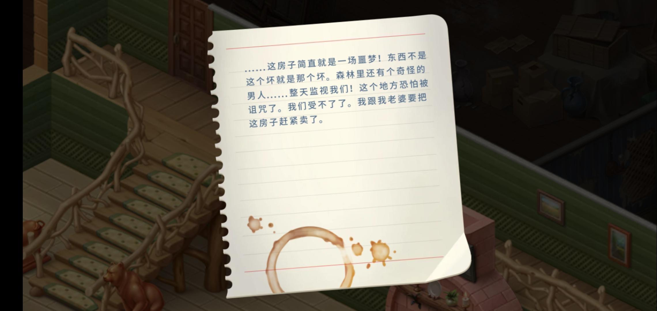 然后奥斯汀在装修新家的时候,发现了一个记事本,上面写道:“....这房子简直就是一场噩梦!东西不是这个坏就是那个坏。森林里还有个奇怪的男人……整天监视我们!这个地方恐怕被祖咒了。我们受不了了。我跟我老婆要把这房子赶紧卖了。”天啊!奥斯汀看到以后更加心惊胆战啦!