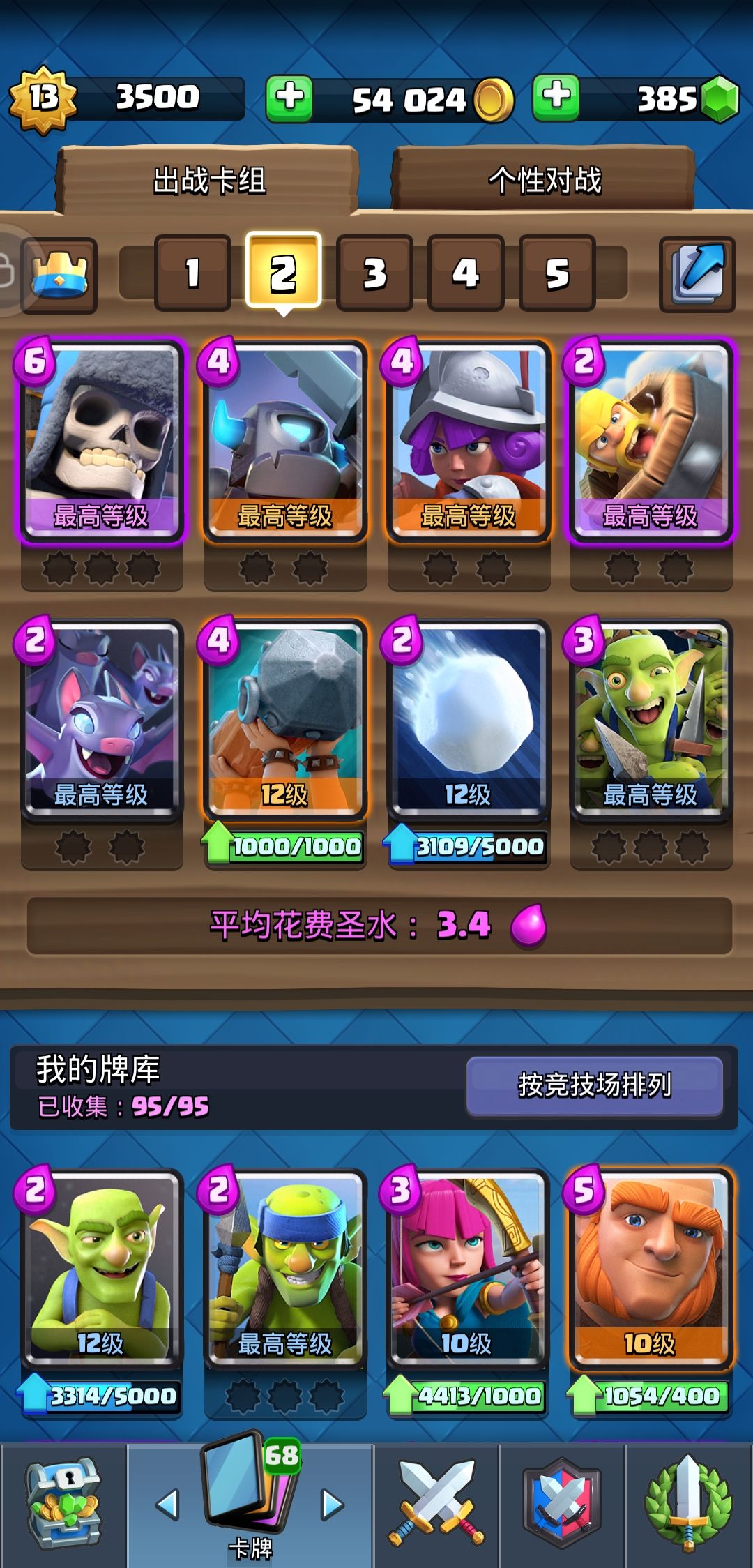 如图就是我目前的配置,这套卡看上去平平无奇,可是如果慢慢发掘,就可以找到其闪光点了,目前最让我对这套卡欣慰的是打赢了一局6600的克隆女巫大骷髅,而且是稳胜之局,遗憾的是视频已经不见了,同样的经典卡组中,自闭桶,皮卡锤,暗夜石头巫,快猪,巨人双王子,巨人电磁炮,超骑骨球等等卡组在6000都有稳胜之局