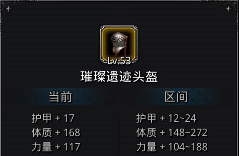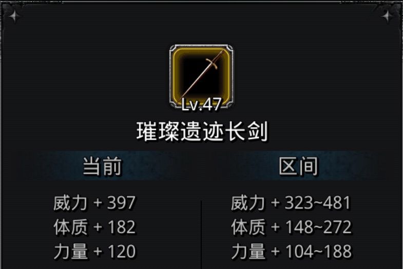 评价:高体中力,特效能量增幅(力量增幅),前中期开荒图14,15,16都很好用,给黑骑带一个,撑体质,再配上银盾,美滋滋,而且撑分也挺好的。后期有了深渊剑和月冕剑后,带来收益会降低,上遗迹7拿了破晓后,璀璨剑就很难发挥作用了。
