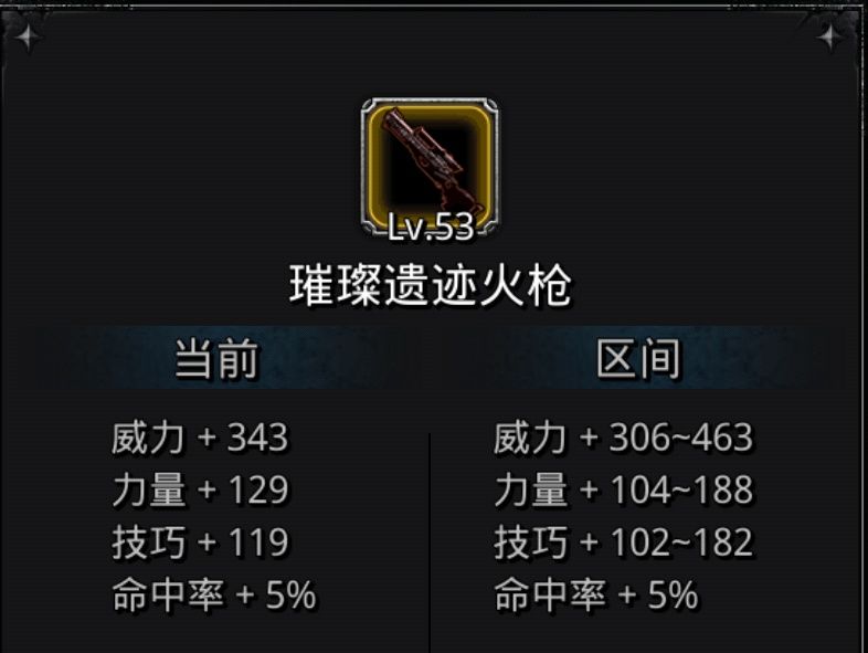 评价:中力中技高威力附带5%命中率,特效(力量增幅)更是没得说,前中后期地位仅冥士(通关裂隙49)有的一比,有了它你会发现你打完大金龙给的火[枪]实用性真的不如璀璨遗迹火[枪](冰葬听完流下了晶莹的泪滴),后期得等到做出来的红枪谢幕才能够取代璀璨遗迹火[枪]。